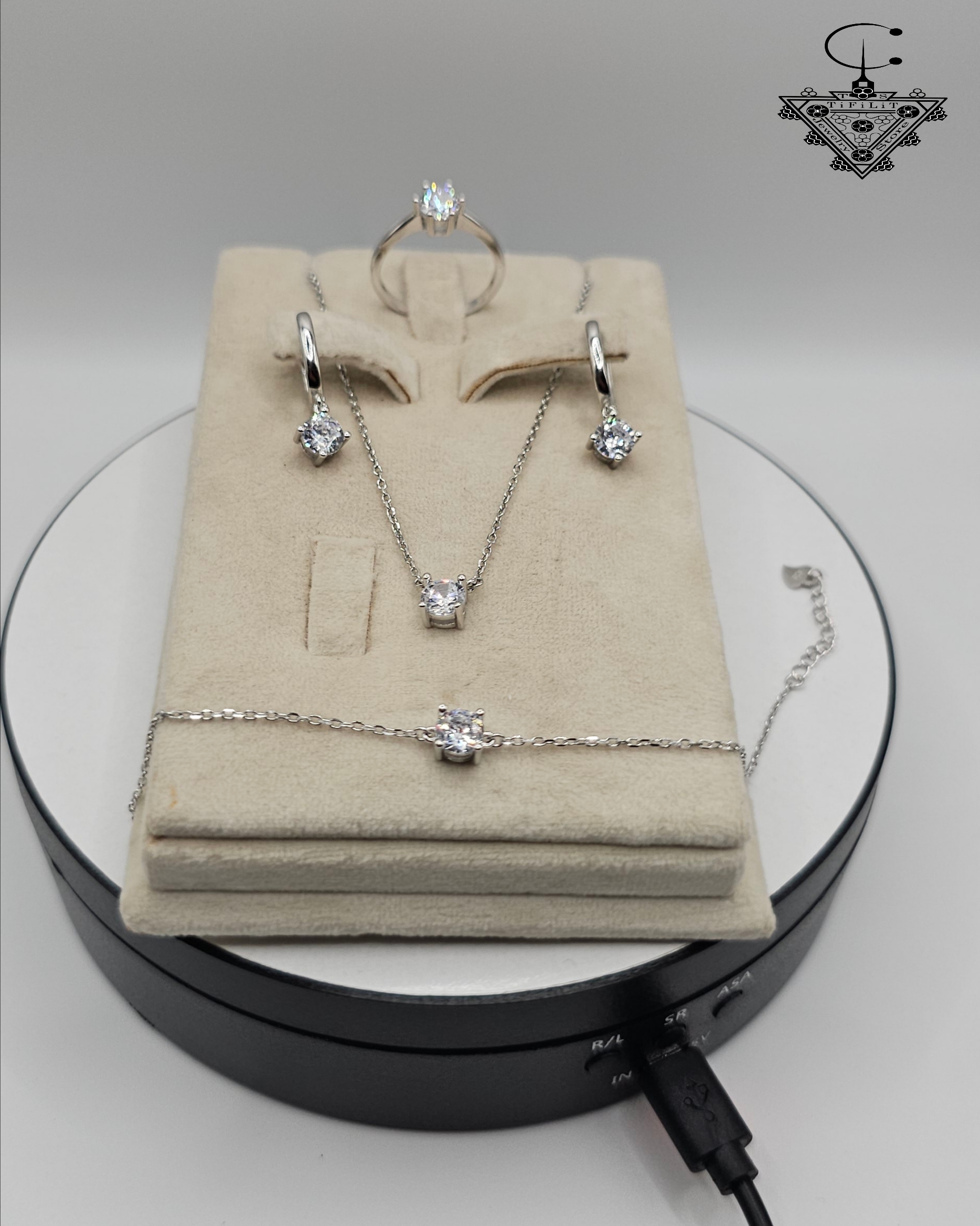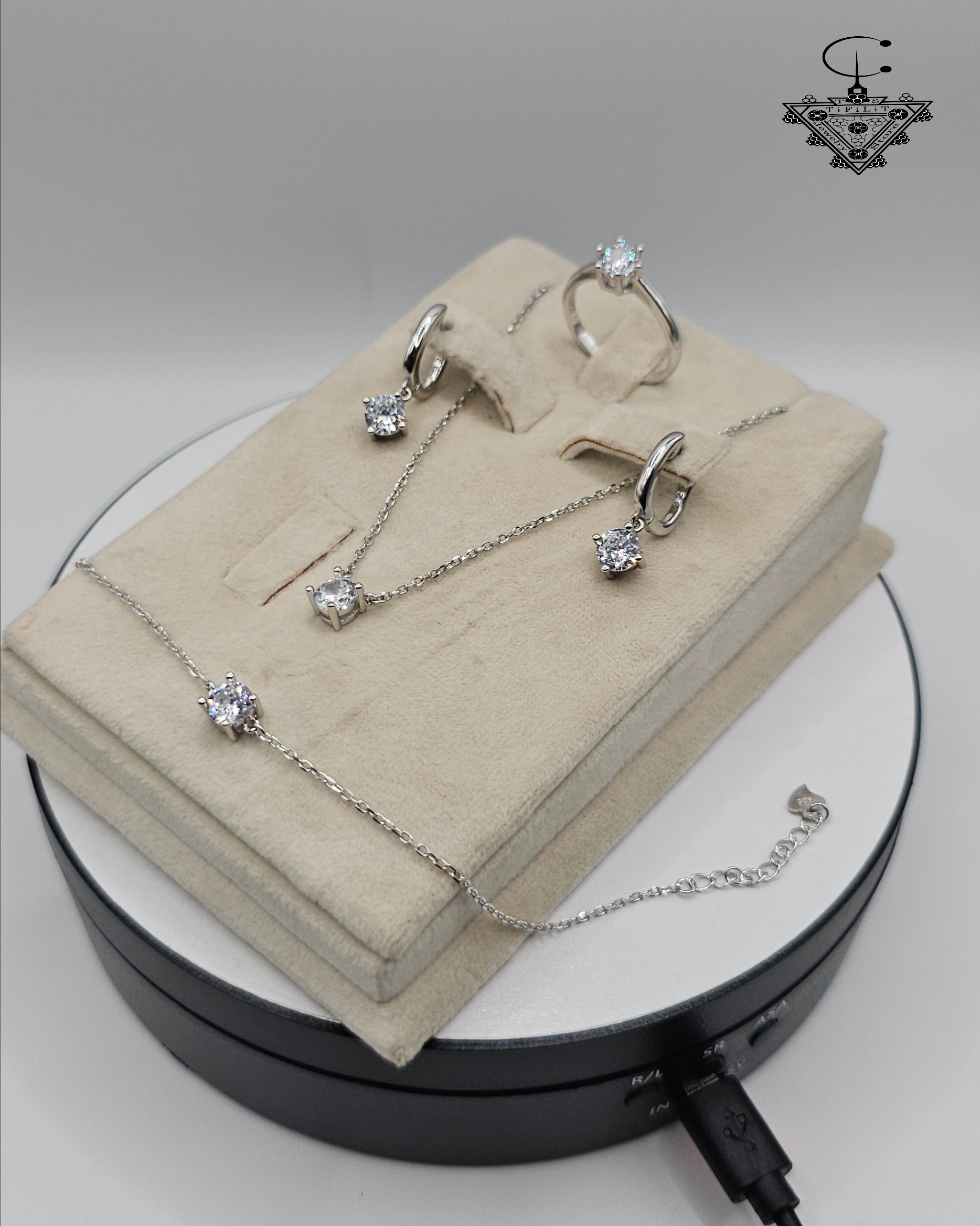 A single zirconia stone sits gracefully at the center of the ring, necklace, bracelet, and earrings, creating a unified design that radiates sophistication and charm. The shimmering white stones reflect light like diamonds, offering timeless beauty for both everyday wear and special occasions.