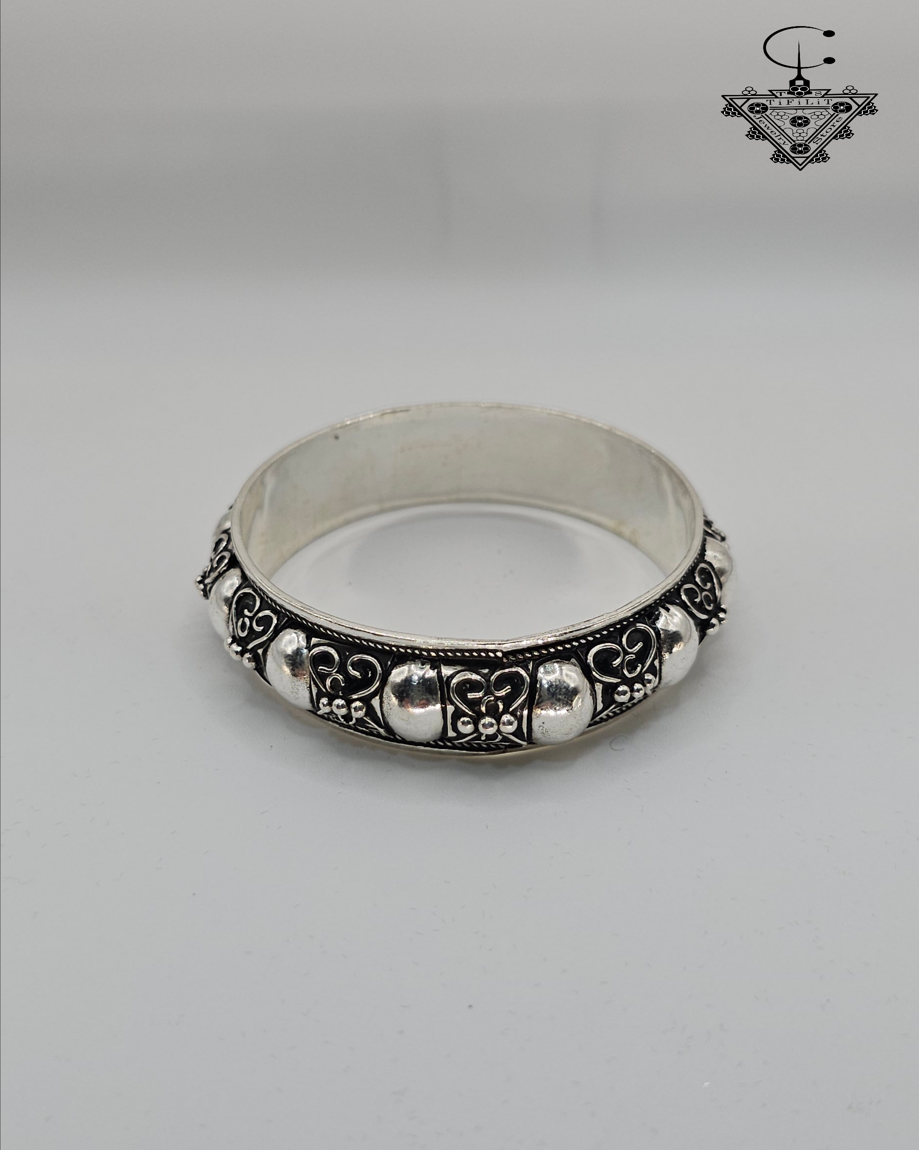 Handmade Amazigh Silver 800 bangle, weight ~33g, featuring raised bead detailing and traditional engraved motifs. A bold cultural piece with timeless heritage.