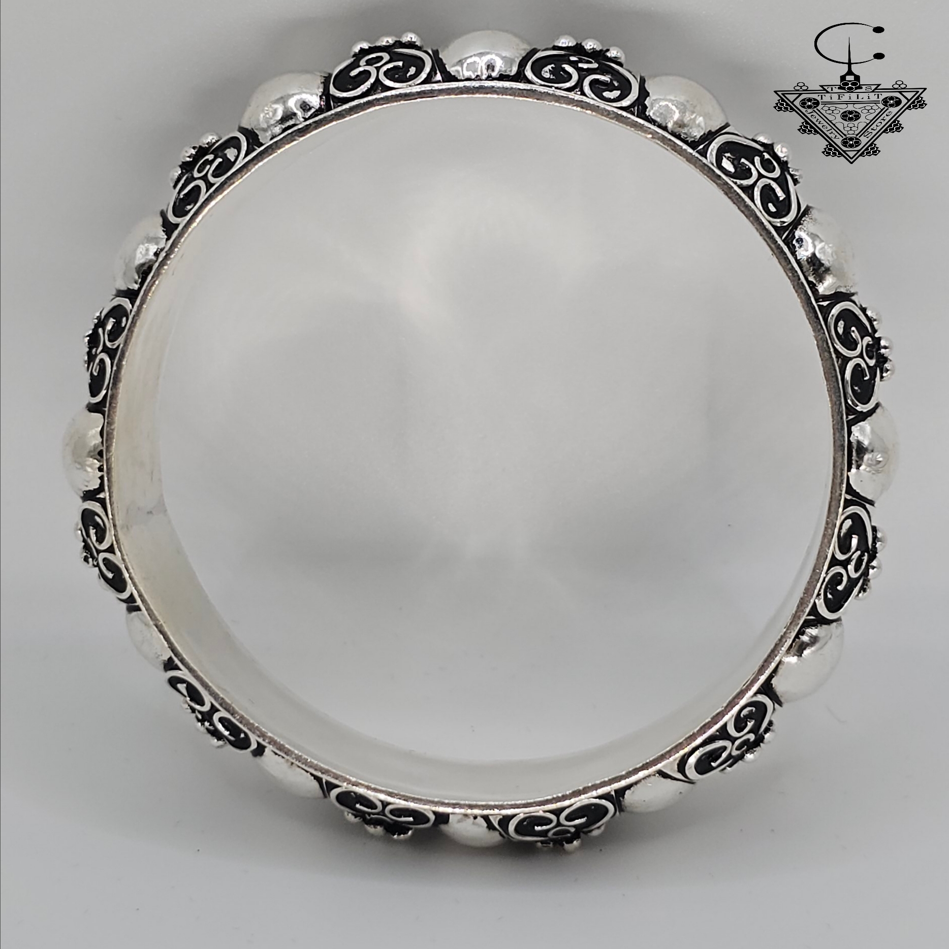 - Detailed engraved patterns with raised silver bead accents