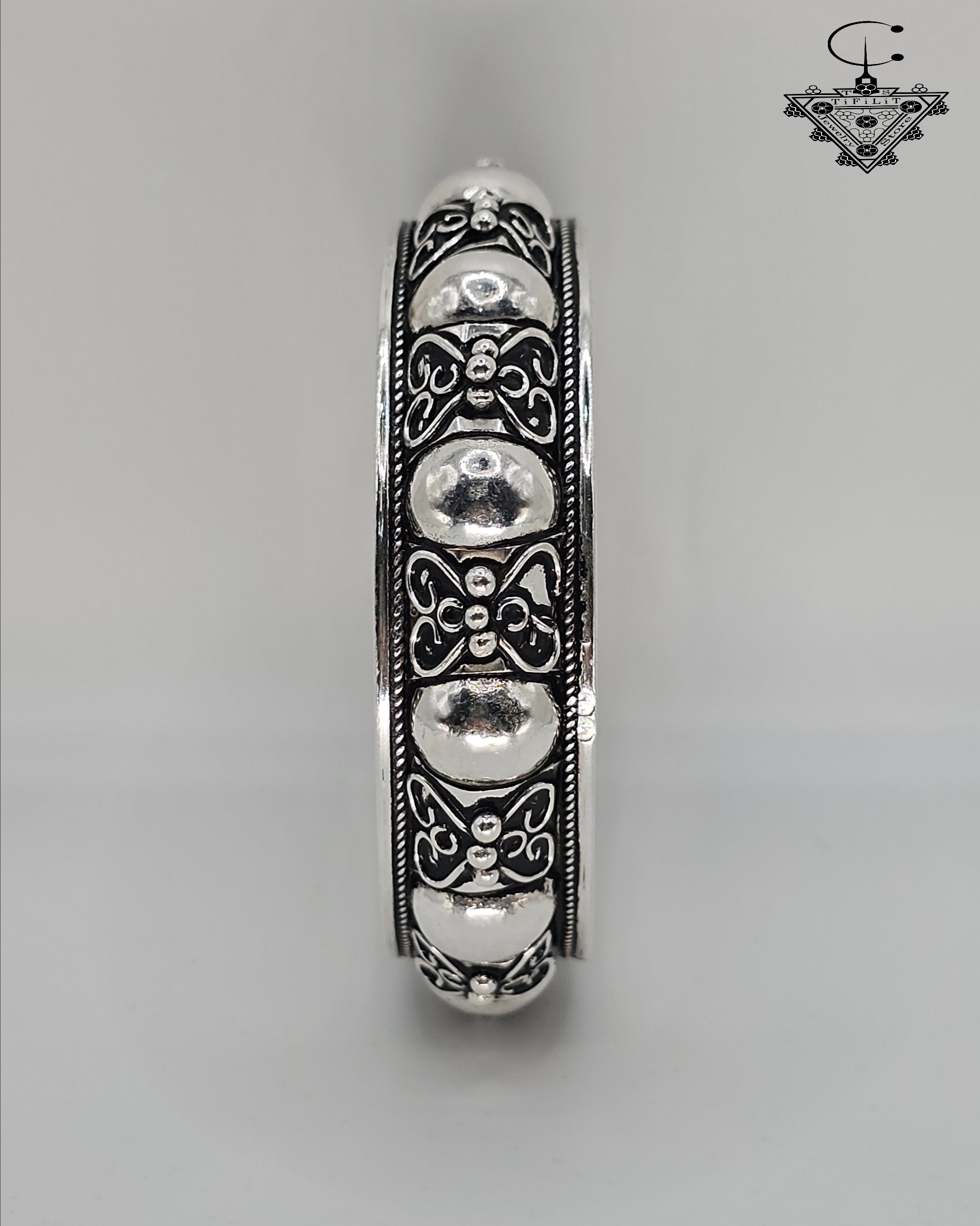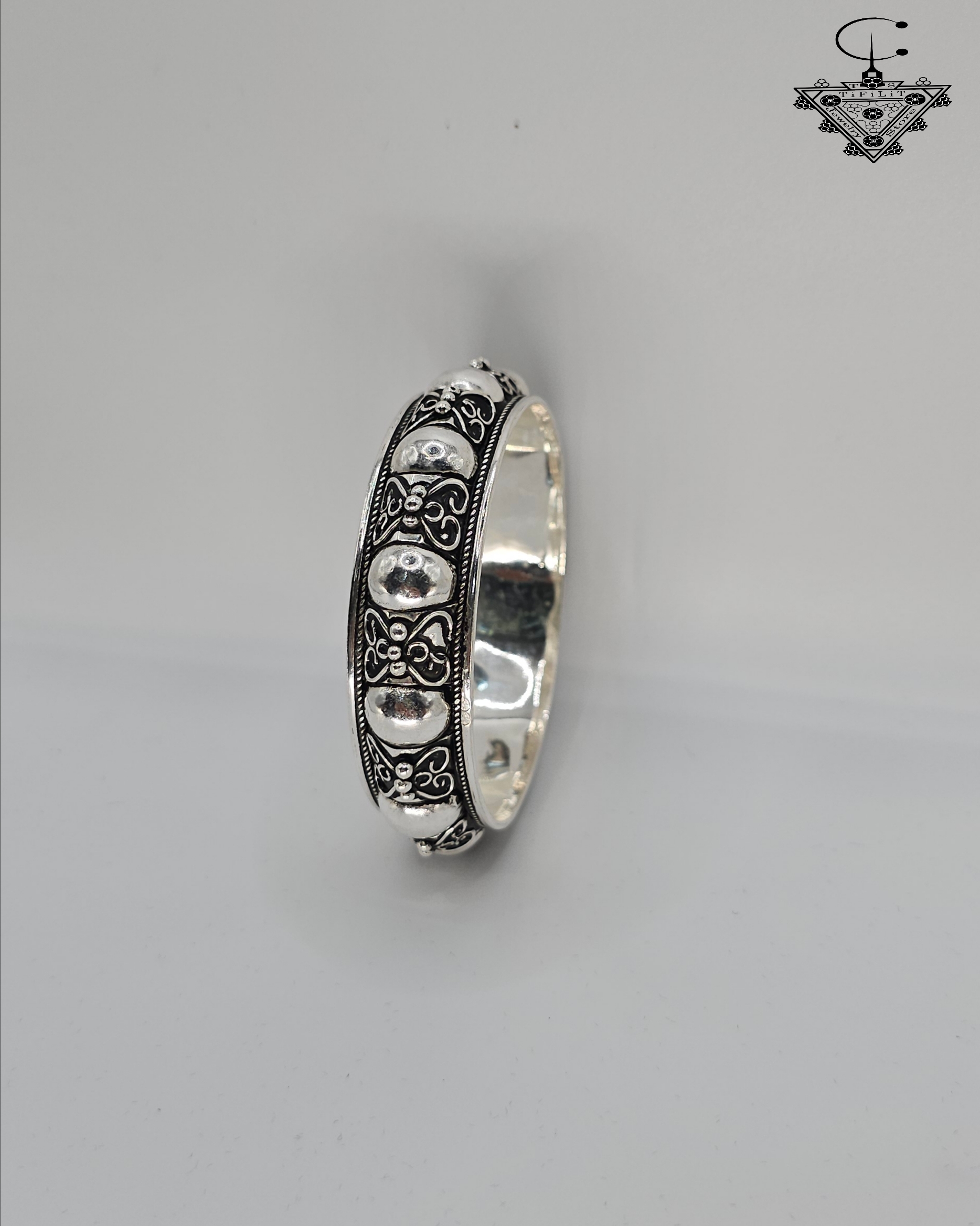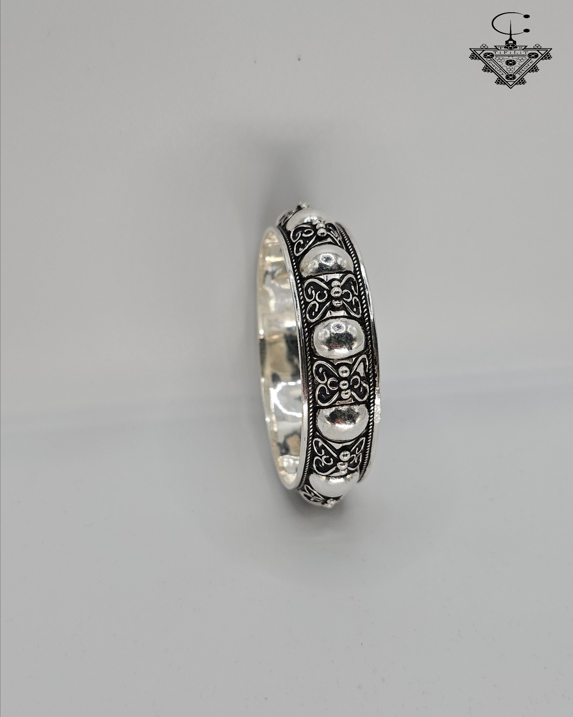 The bracelet features a continuous row of rounded silver bead elements, framed by intricate engraved motifs that showcase the precision of traditional silversmith work. These patterns are shaped carefully by hand, using techniques passed down through generations of Amazigh artisans. The contrast between the polished beads and the darker engraved background creates depth, character, and a visually rich texture.