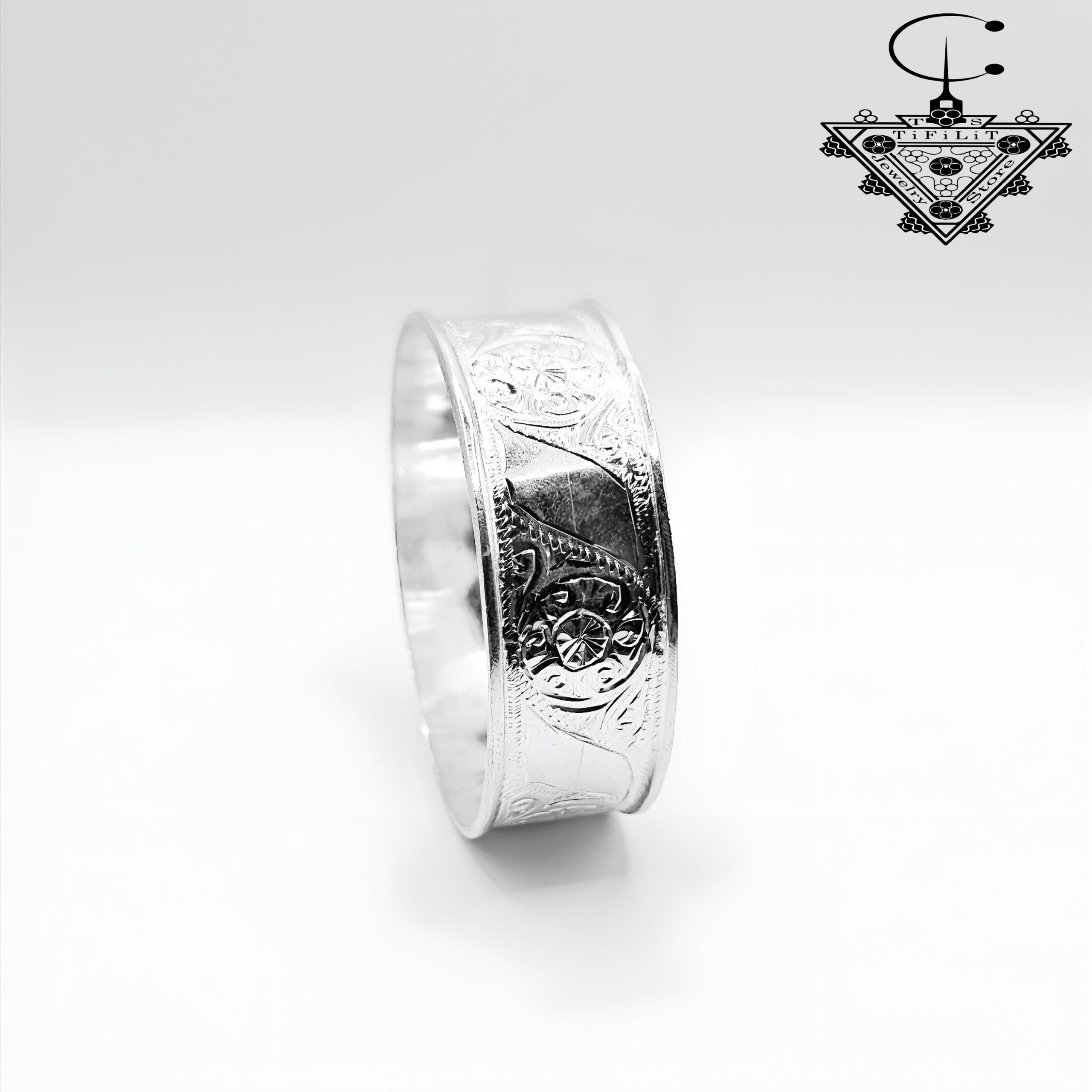This handmade Amazigh bangle is crafted from Silver 800 and weighs approximately 20 grams. It reflects the rich heritage of Amazigh traditional culture, where jewelry is valued not only for its beauty but also for its identity and symbolism.