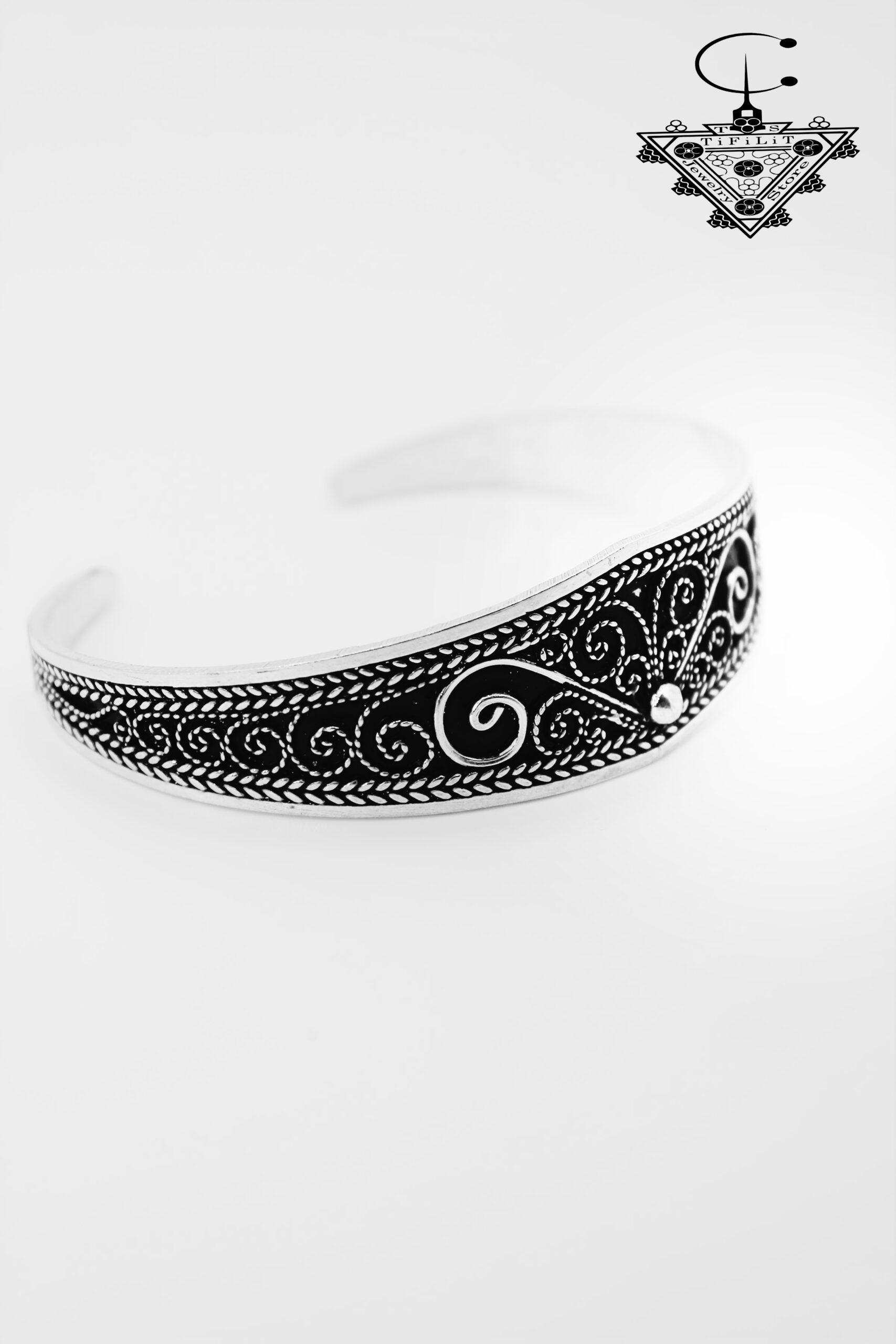 Each detail is shaped and engraved by hand using traditional techniques passed down through generations. The patterns featured on the bracelet are inspired by ancient Amazigh symbols, often associated with protection, femininity, and connection to ancestry. Its lightweight yet solid form makes it comfortable for daily wear, while its cultural character adds meaning to every outfit.