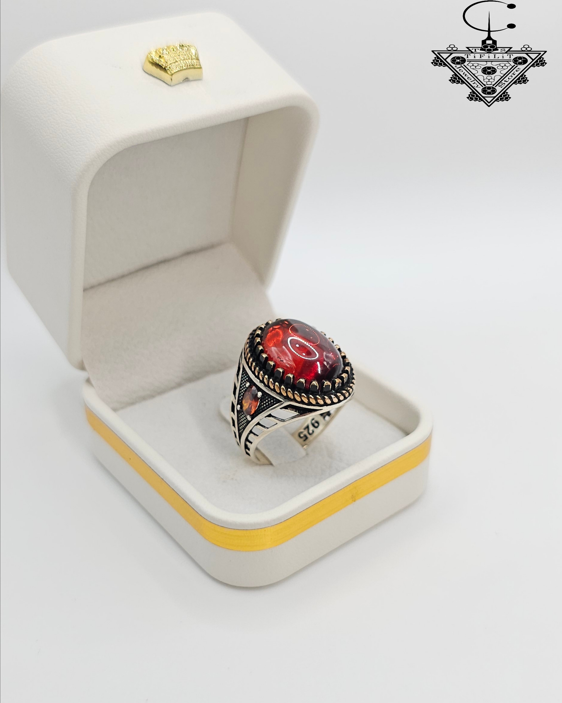 The combination of the large central red stone and polished silver setting creates a classic signet-style design that stands out while remaining elegant and wearable for both special occasions and daily style.